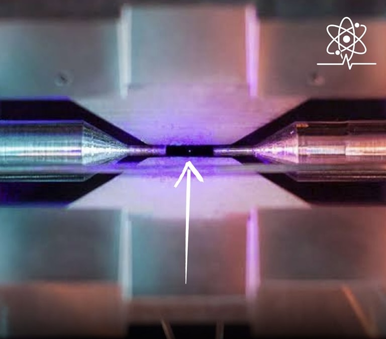 In the photograph, the atom is held almost motionless in place by a pair of metal electrodes.